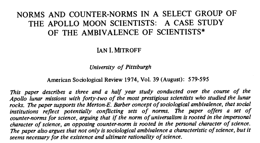 | Disinterestedness: “Scientists are expected by their peers to achieve the self-interest they have in work–satisfaction and in prestige through serving the [scientific] community interest directly” (Barber, 1952:132). | Interestedness: Scientists are expected by their close colleagues to achieve the self-interest they have in work-satisfaction and in prestige through serving their special communities of interest, e.g., their invisible college (Boguslaw, 1968:59; Mitroff, 1974b) |